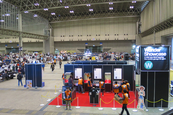 ▲「……そういえばこの角度からWSCブースを撮影したことはなかったなあ」と思い、俯瞰から撮影してみました。幕張メッセの4ホール内で、WSCブースが占める「存在感」がよくわかっていただけるのではないでしょうか ■模型雑誌への広告出稿というかたちから、WSC公式Webサイトに発表の場を移したWSCプレゼンテーション報告書も今回で3回目。前回も前々回も同様のことを記しましたが、このWSCプレゼンテーション報告書は「ワンフェス当日にWSCアーティストたちの作品がどのような売れ方をしたか=信任投票されたかを赤裸々に報告する」と同時に、「レジンキャストキットのリアルな現在(いま)をアマチュアディーラーの皆さんと共有していくためのリポート」だと考えてください。 ■WSCはなんといっても“ワンフェス公式レーベル”ですから、たとえば「プレゼンテーション作品が早々と11時に完売してしまった」といった事態は絶対に避けたいため、レーベル立ち上げ当初より赤字覚悟で「売れ残って当然」な個数を生産し続けてきました。 ■それでも前回=第31期/'16年夏までは「ワンフェス会場販売個数=100個」をやせ我慢的にキープし続けていたのですが、いよいよその“100個”というハードルが昨今のバッケンレコードに近付きはじめてしまったに至り、今期=第32期WSCプロデュースアーティスト3名のプレゼンテーション作品は「ワンフェス会場販売個数=80個」とせざるを得なくなってしまいました。 ■いや、この件はここで一度「閑話休題」としましょう。