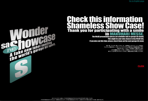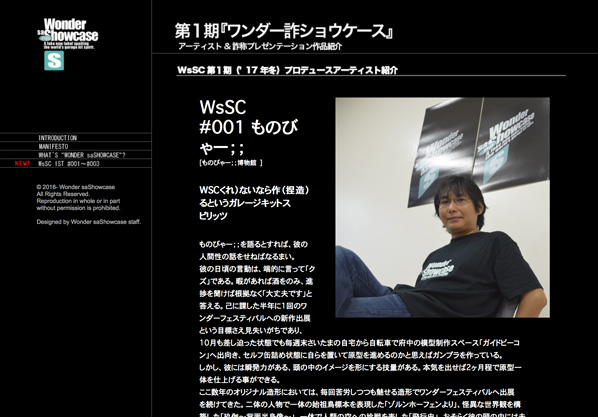 ▲4-19-14『ワンダー詐ショウケース』ブースの様子と、彼らのWebサイト。作品もなかなかのものでしたが、ブースでのディスプレイも美しい! そしてWebサイトのパロディ具合は「完璧」のひとことで、さらに英語ページが備わっているぶん本家WSCよりも優れている!?(汗) わざわざ“WcSCスタイルTシャツ”まで作成した徹底ぶりにも脱帽です! ■そんなこんなで今回のアフターリポートでは第32期WSCアーティストたちについて何も触れることができませんでしたが、できればもう一度、可能ならばいますぐにでも彼らのアーティスト解説を読み返してみてください。「たかだか80個のプレゼンテーション作品が完売に至らなかった3名」などというくだらない括りで括ることは絶対にできない、すばらしく特化した才能の持ち主たちです。そしてその事実は必ずや、2~3年後のワンフェスにて証明されることでしょう。 (※なお、WSCのワンフェス ガイドブック表4広告にて、WSC#086 pateのプレゼンテーション作品『プリズマ☆イリヤ サファイヤVer. -WSC Edition-』が“プラズマ☆イリヤ”とタイピングミスされていた事実がワンフェス終了後に発覚してしまいました。関係各位様にご迷惑をおかけしたことを大変申し訳なく思います。誠に申しわけございませんでした。)