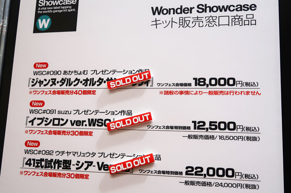 WSC#090 あかちょむのプレゼンテーション作品『ジャンヌ・ダルク・オルタ・サンタ・リリィ』(ワンフェス会場価格18,000円)は、ワンフェス会場販売分40個限定で40個の販売=完売。WSC#091 suzuのプレゼンテーション作品『イプシロン ver.WSC』(ワンフェス会場特価/12,500円)は、ワンフェス会場販売分30個限定で30個の販売……の予定だったのですが、ワンフェス終了後の販売も見越し42個生産したすべてを持ち込んでしまったため42個の販売=完売。WSC#092 ウチヤマリュウタのプレゼンテーション作品『41式試作型 -シア- Ver.As』(ワンフェス会場特価/22,000円)は、ワンフェス会場販売分30個限定……の予定だったのですが、こちらもやはりワンフェス修了後の販売も見越し44個生産したすべてを持ち込んでしまったため44個の販売=完売。