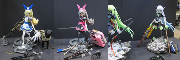 ▲こちらがウチヤマのアーティスト解説内で触れた、「“1/6アクションフィギュア用に市販されている塗装済み完成品の小物をそのまま転用できることがプレイバリューの高さと直結している”という旨がまったく説明されぬまま、1/6アクションフィギュア用の小物がディーラー卓上にずらずらと並べられていて、“これらもキットの付属品なのか?”と多くの人から誤解を招くこととなった'17年冬のワンフェスにおける『ダイタイロボット』ブース」の図。そりゃあアナタ、誰だってそう誤解しますぜ……