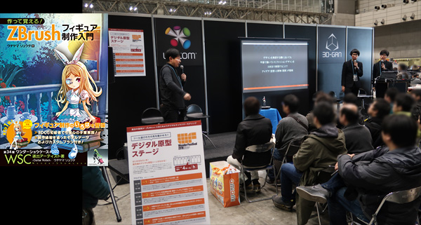 ▲ウチヤマは初の著書たる『作って覚える! ZBrushフィギュア制作入門』(2月25日発売予定/発行:株式会社ボーンデジタル/定価:本体2,800円+税)が発売直前ということもあり、3D-GANとワコム主催によるデジタル原型ステージの講演3「今期WSCアーティスト著、ZBrush4R8書籍の紹介とキャラクターデザイン」にも登壇。ウチヤマにとってはおそらく一生忘れることのできない回のワンフェスになったのではないかと思います