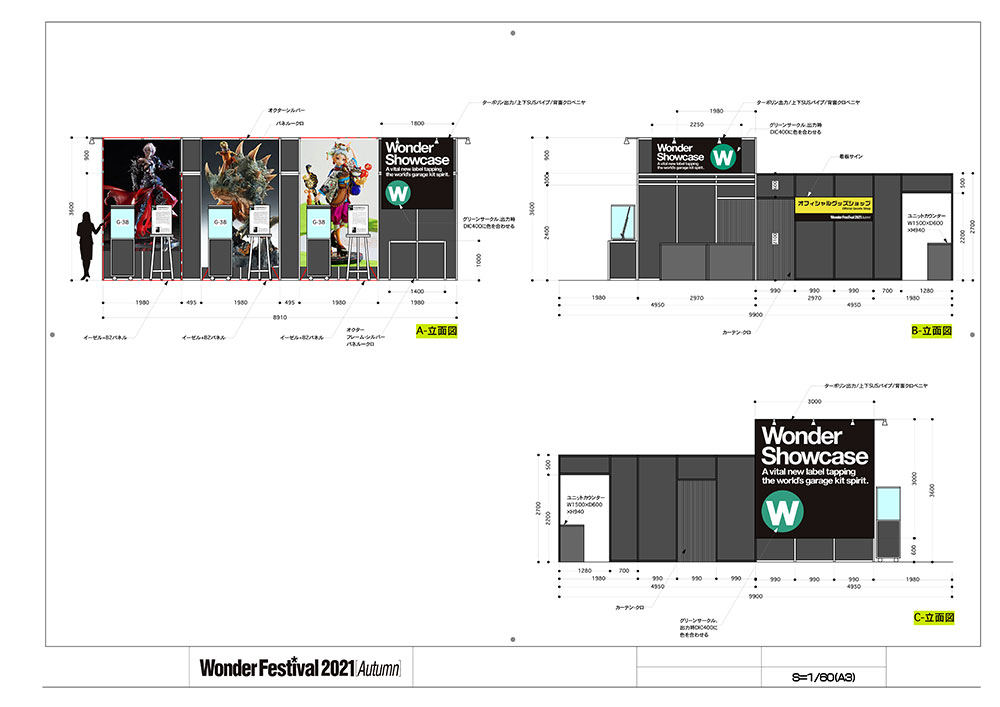 ▲2021年秋ワンフェスの開催は幻に終わってしまいましたが、2021年秋ワンフェスにおける第39期WSCプレゼンテーションのブース施工デザインはこのように大幅に変更される予定でした。「WSCアーティストがWSCに選出されたことを今まで以上に誇りに思えるようにしよう!」ということがそのコンセプトで、3mサイズの巨大なターポリン(塩化ビニール系多層素材)にプレゼンテーション作品画像を印刷し装飾する──という内容になるはずだったのですが……