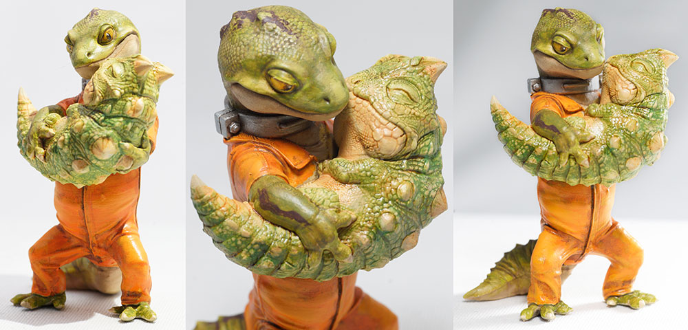 ▲プレゼンテーション作品『Brains & Brawn』の以前に製作された前日譚的な作品、『Brains meets Baby』。Brainsが抱いている赤ちゃんトカゲがのちに成長して巨大化し、Brawnと化す……という設定です。「説明がなくとも画を見ただけで伝わってくるふたりのあいだの空気感や繋がり」を大切にする、“関係性萌え”属性たるSagata Kickらしい作品と言えるでしょう