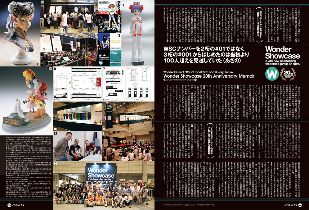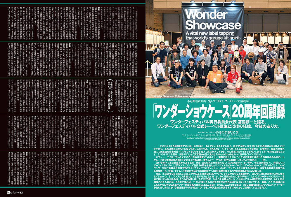 ▲本文中でも触れた2021年2月12月発売の『レプリカントEX8』(竹書房)では、筆者の手による記事“MAレプリカント ワークショップ”『「ワンダーショウケース」20周年回顧録』なる記事が9ページにも亘って掲載されているので、まだ未読の方はぜひともご一読いただきたく思います。WSC誕生への経緯から今現在におけるまでの流れが一気に把握できる内容となっていると共に、これまで明かされなかった宮脇センムのWSCへの本音などがダイレクトにテキスト化されています。しかしこの「WSC創設20周年記念プレゼンテーション」が開催されたのは、2019年7月28日……つまり、もう2年以上も昔の話なんですよね。「ワンフェスが3回連続で開催中止になっている」という異常(非常)事態を、いやがうえにも実感させられる次第です