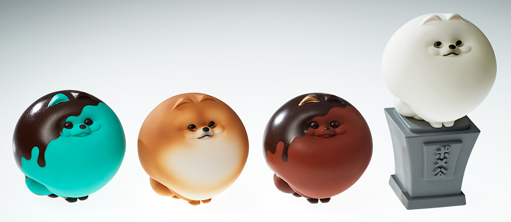 ▲ソフビ製『ポメ公』のカラーバリエーション展開。台座に乗せるとコレが忠犬ハチ公のパロディであることが分かります。ユニークなのはドーナツ的なカラーバリエーションで、チョコミント系の塗装が美味しそう!