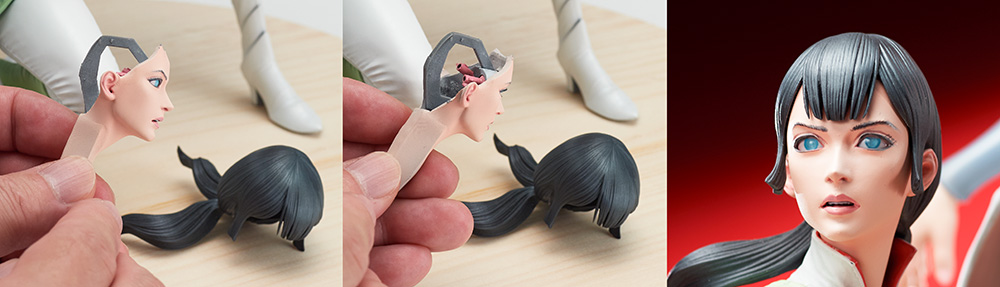 「頭部は内部構造のギミックが再現された独特の作りになっており、眼球は瞳孔部分を凹状にへこませて造形しています。そして瞳孔部分を塗装したのちにクリアーカラーを塗装するのではなく、クラフト用UVレジンを瞳孔部分の凹みに垂らしているんです。さらに表面張力を利用して、瞳孔部分を若干盛っています。そのほうが撮影の際にハイライトが入りやすくなるので。